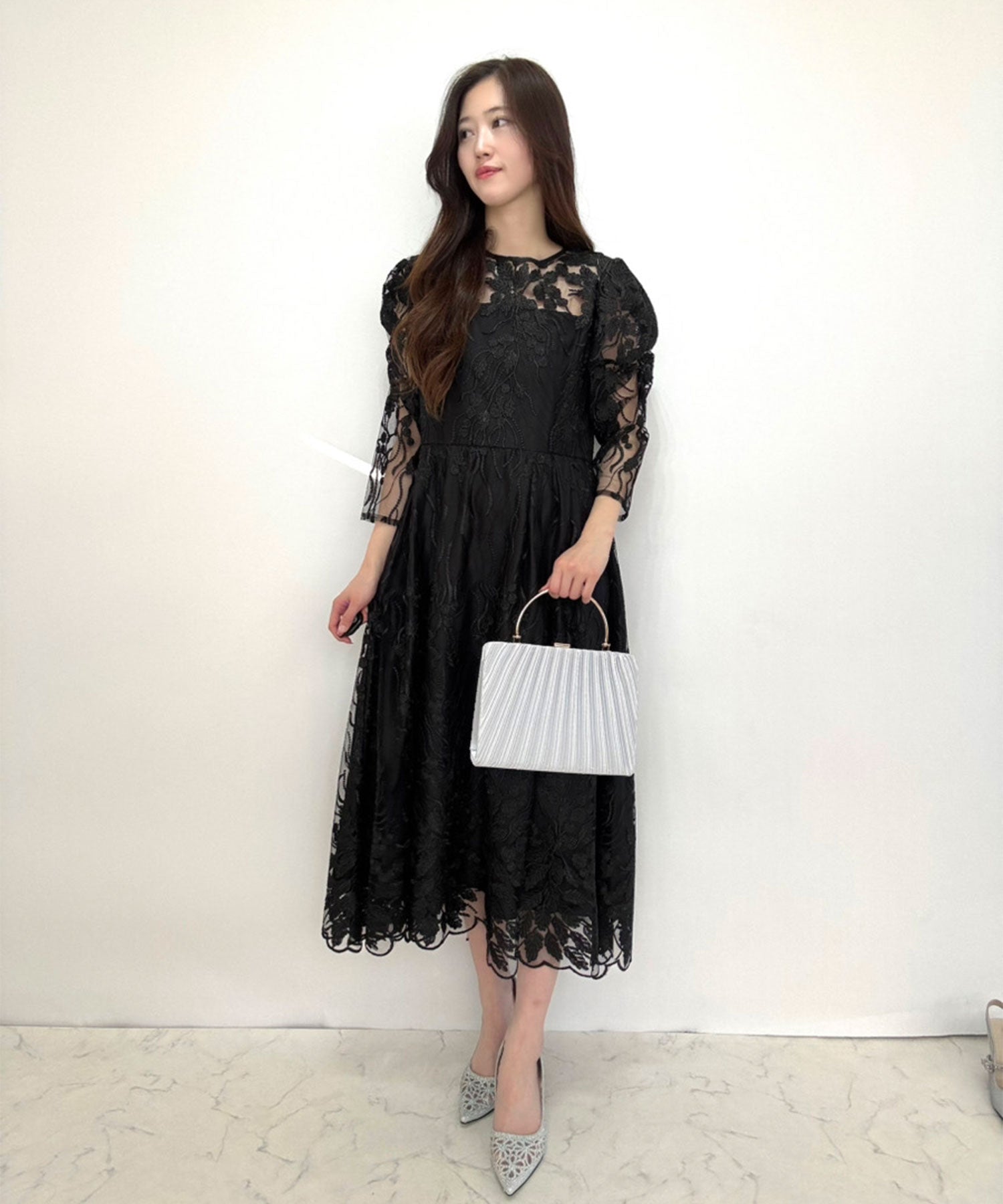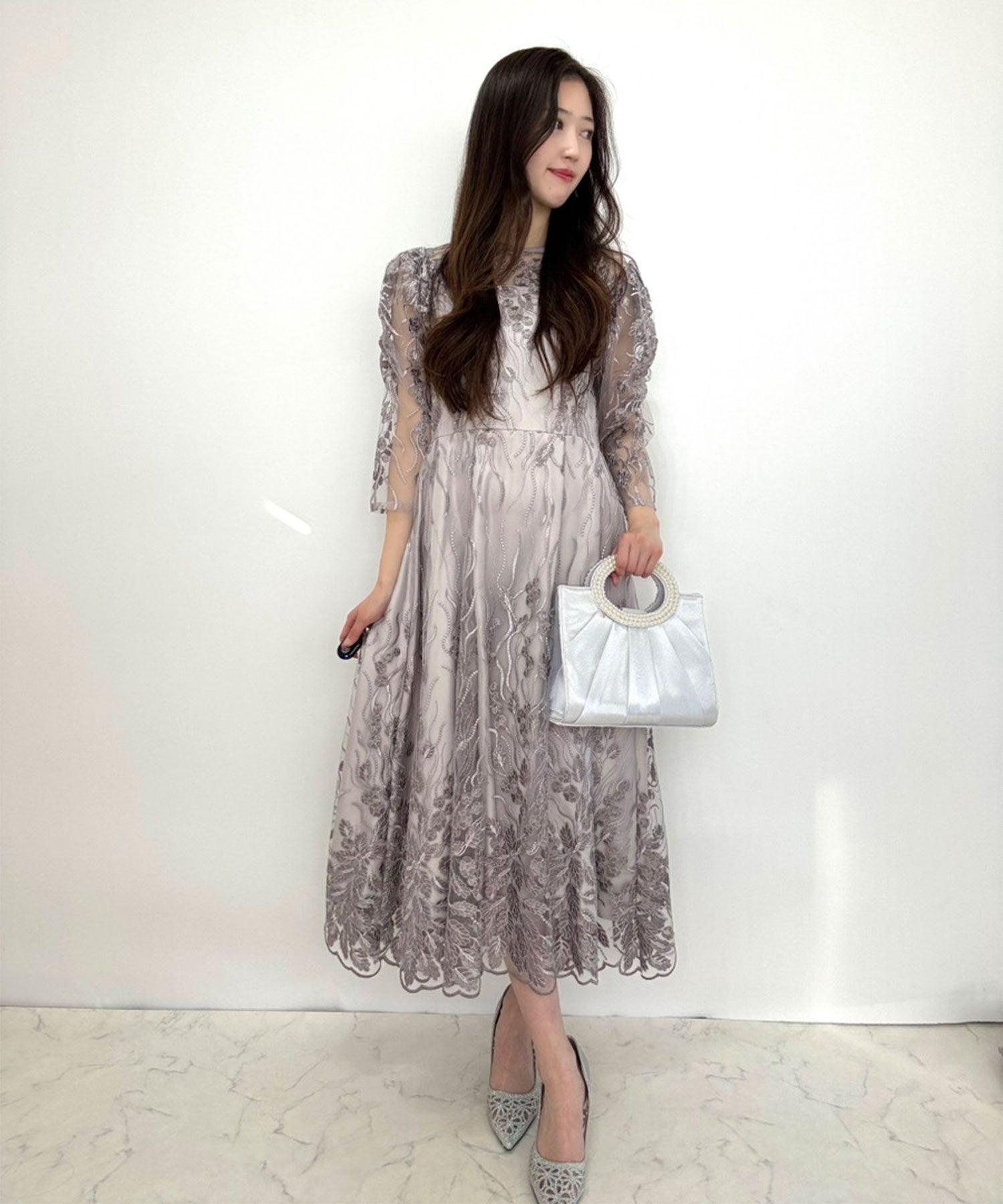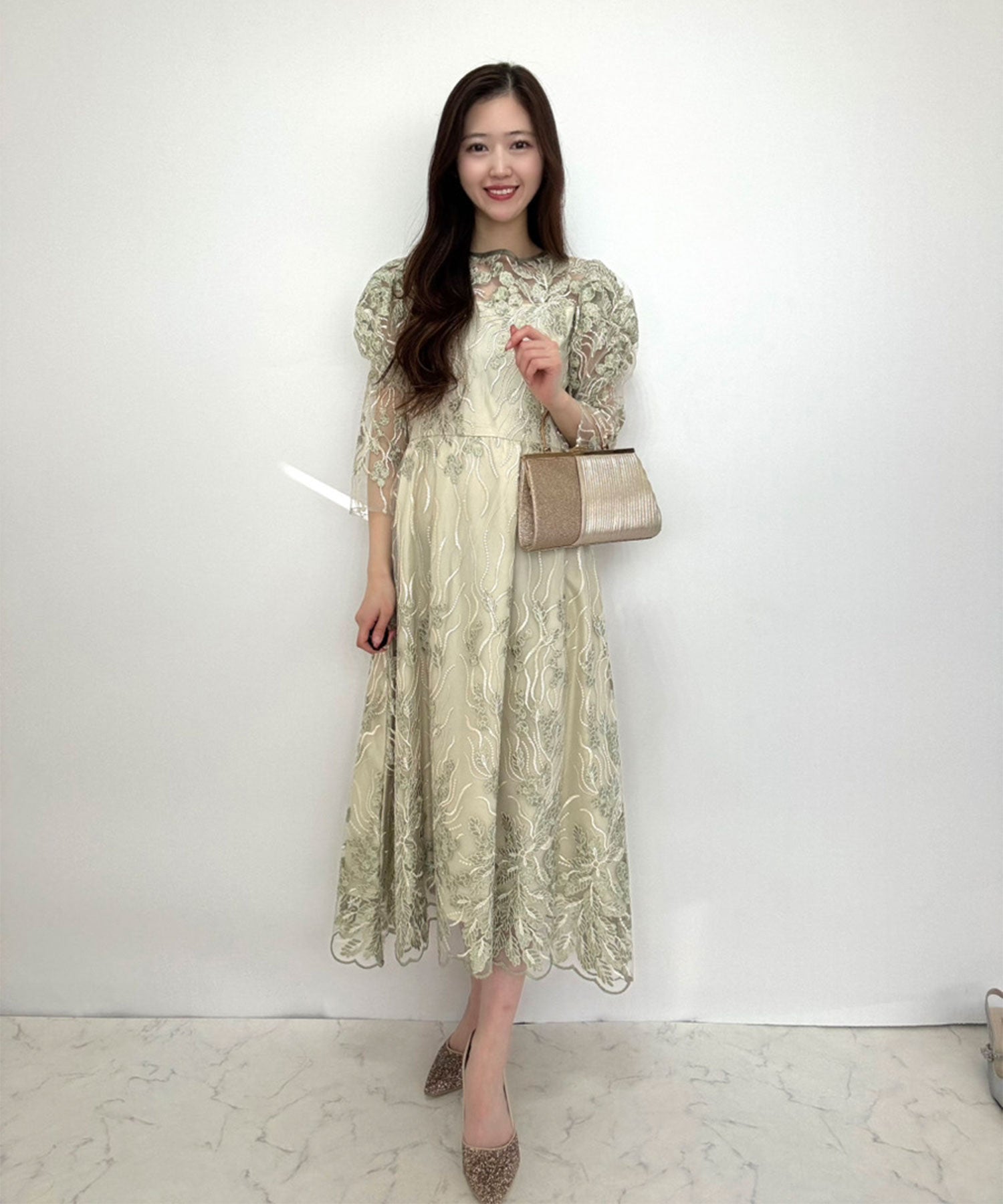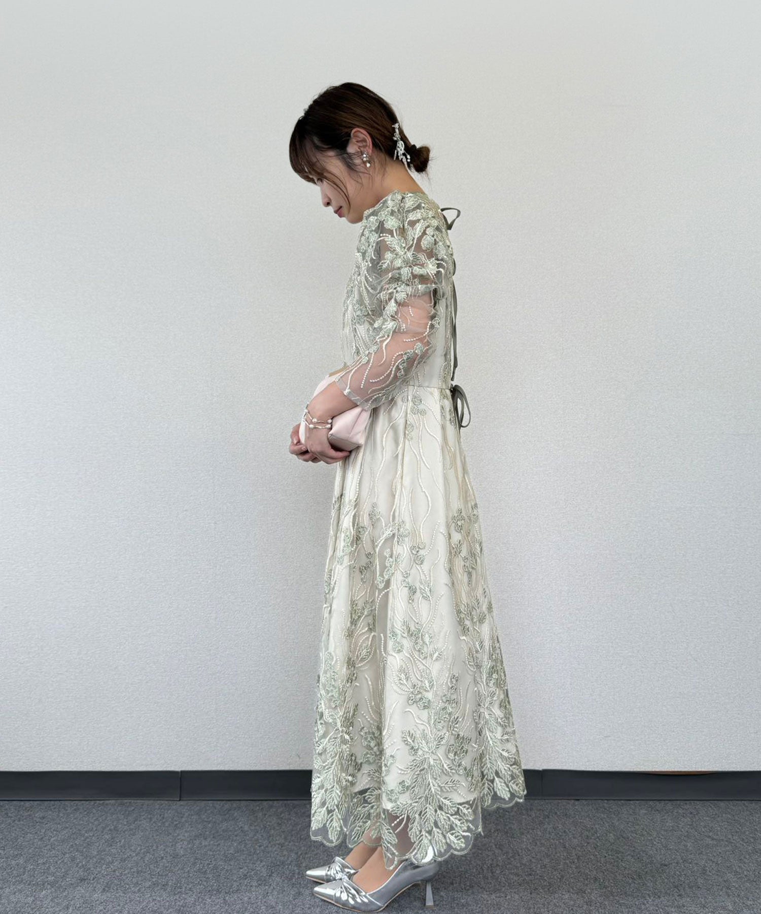 リーフ柄がメインのボタニカルデザイン刺繍が特徴的なドレス。