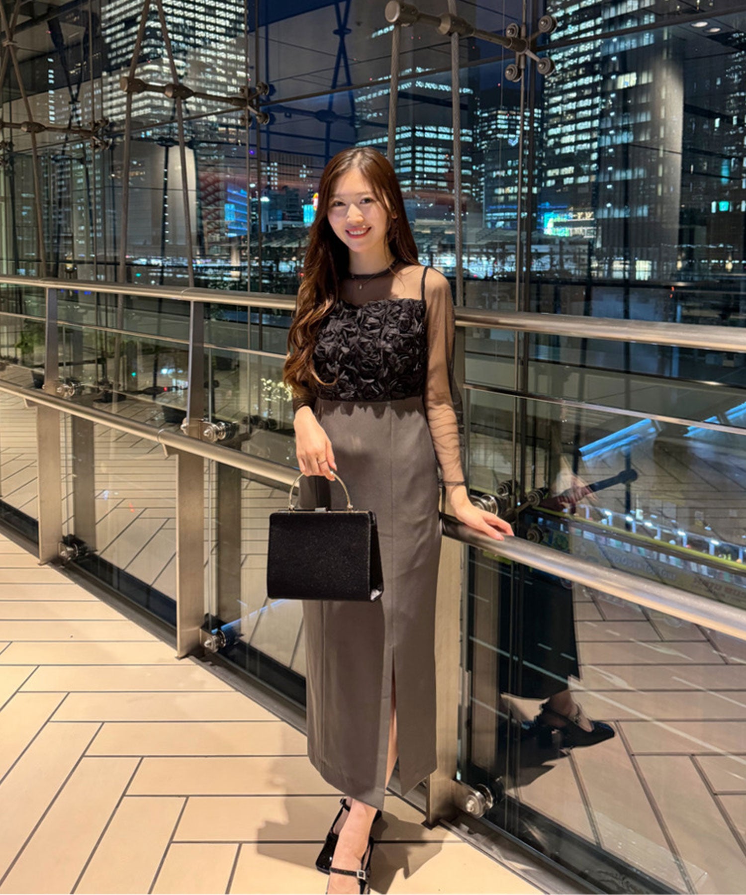 立体的なブラックローズが咲き誇る胸元に、Iラインのスリット入りタイトスカートが織りなす、洗練されたモダンなシルエット。セットアップならではの統一感と着回し力も兼ね備えています。