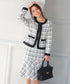 縁取りデザインが全体を引き締めてくれるジャケットと女性らしく可愛らしいマーメイドシルエットのスカートのセットアップスーツ。