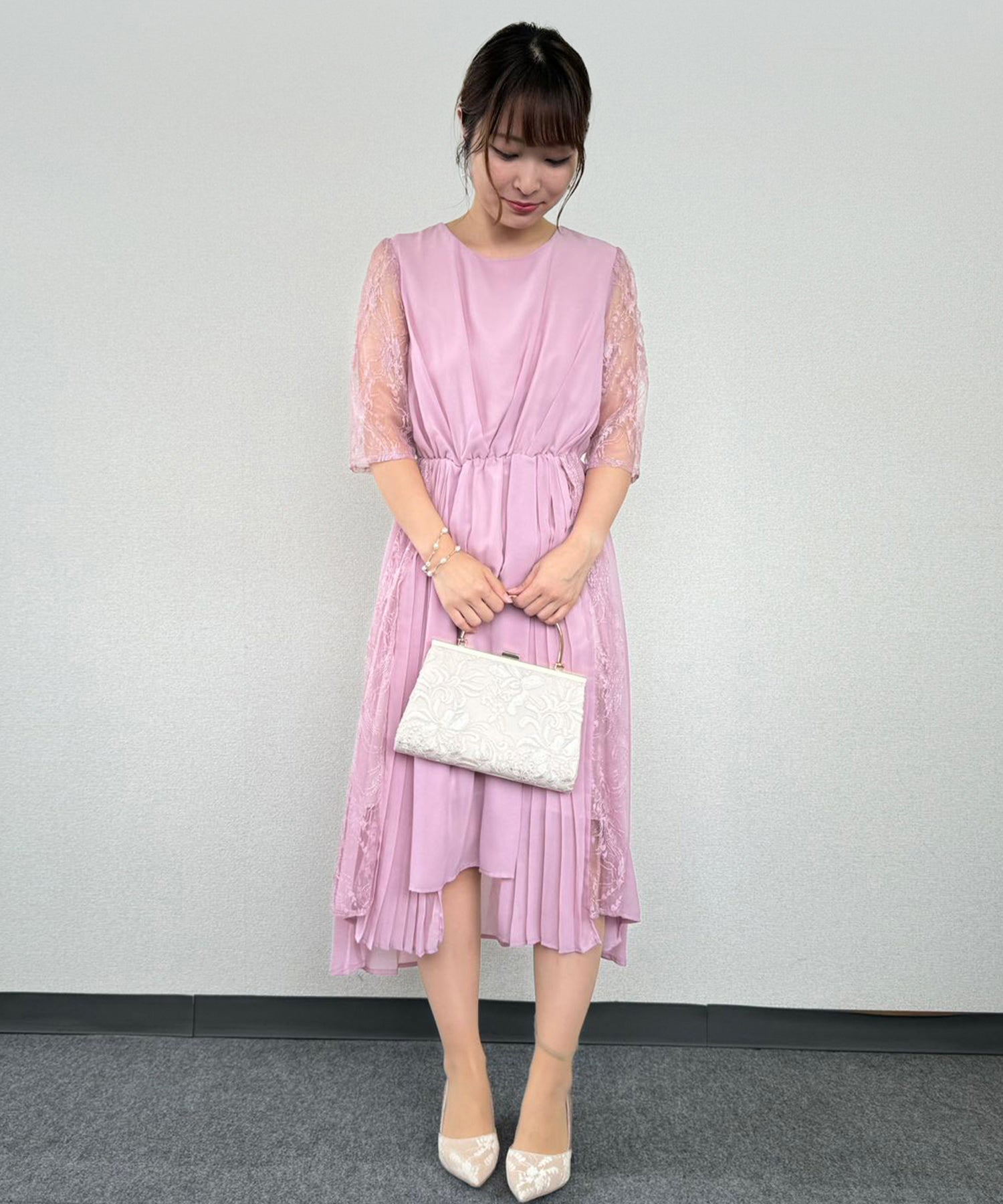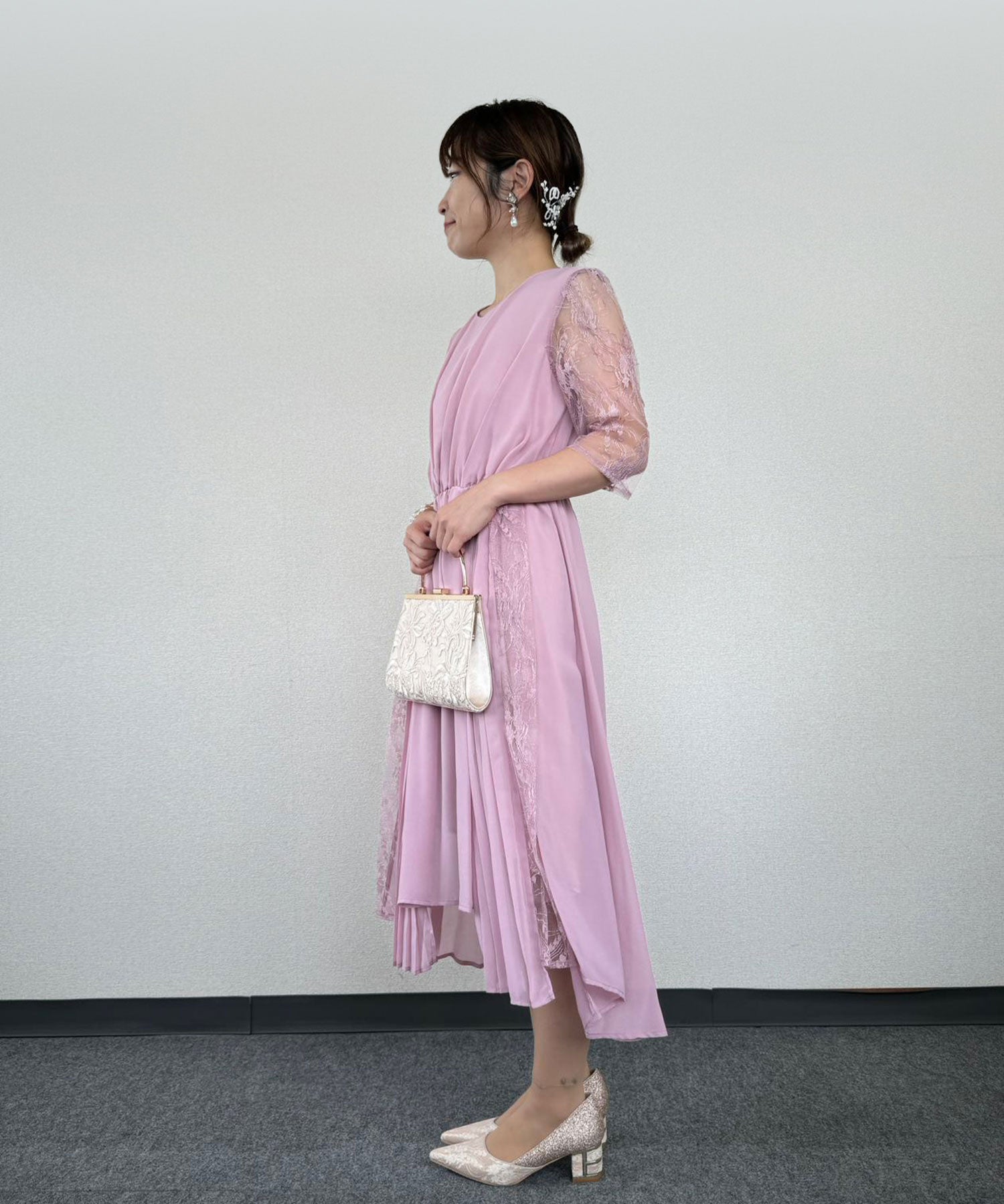 軽やかでシアー感のある素材や、フレアスカートで可愛らしさを足しつつスッキリとした首元で甘さを抑え、大人っぽく着られるフェミニンなドレスに仕上げました。