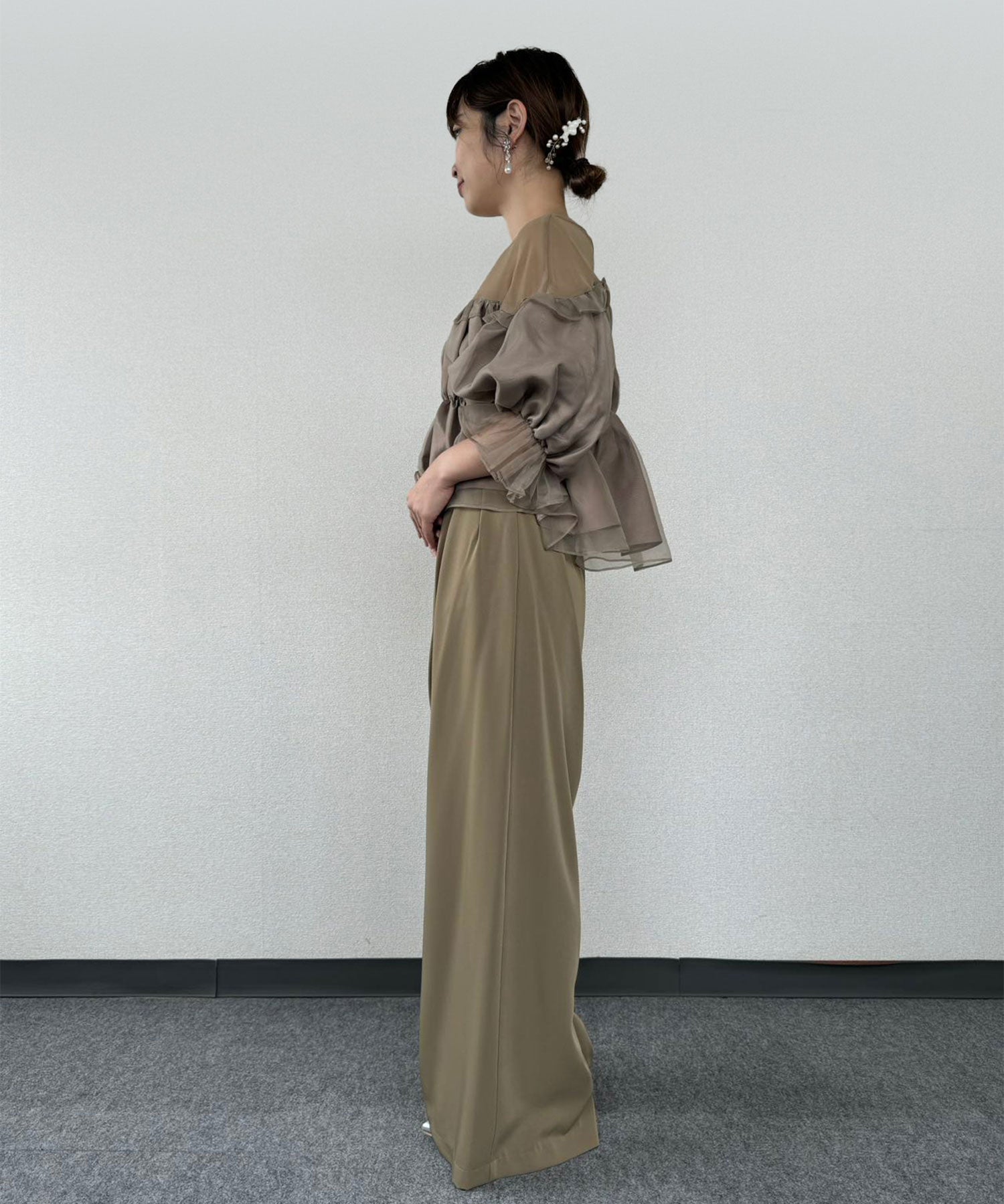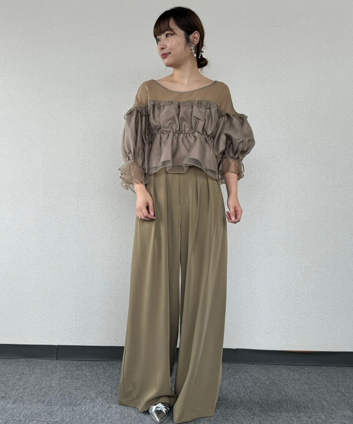 トップスはギャザーをたっぷり寄せたボリュームのあるデザイン、