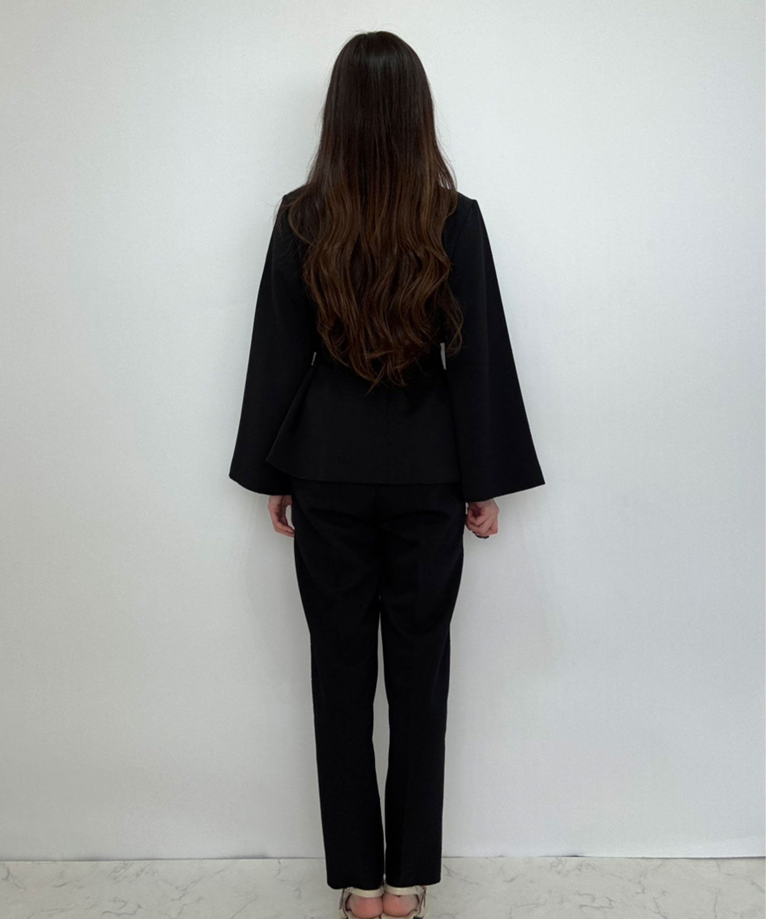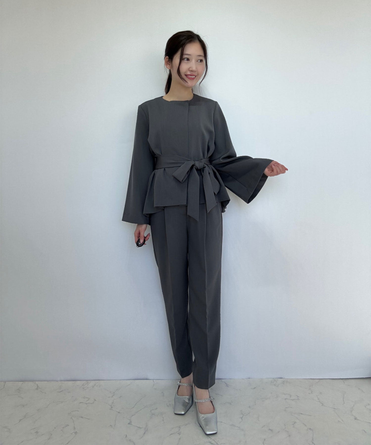 商品名:卒業式・入学式・学校行事・結婚式 対応【手洗いOK】ノーカラー パンツスーツ ママ セレモニー フォーマル フレアスリーブ ウエストリボン きれいめ セットアップ スーツ