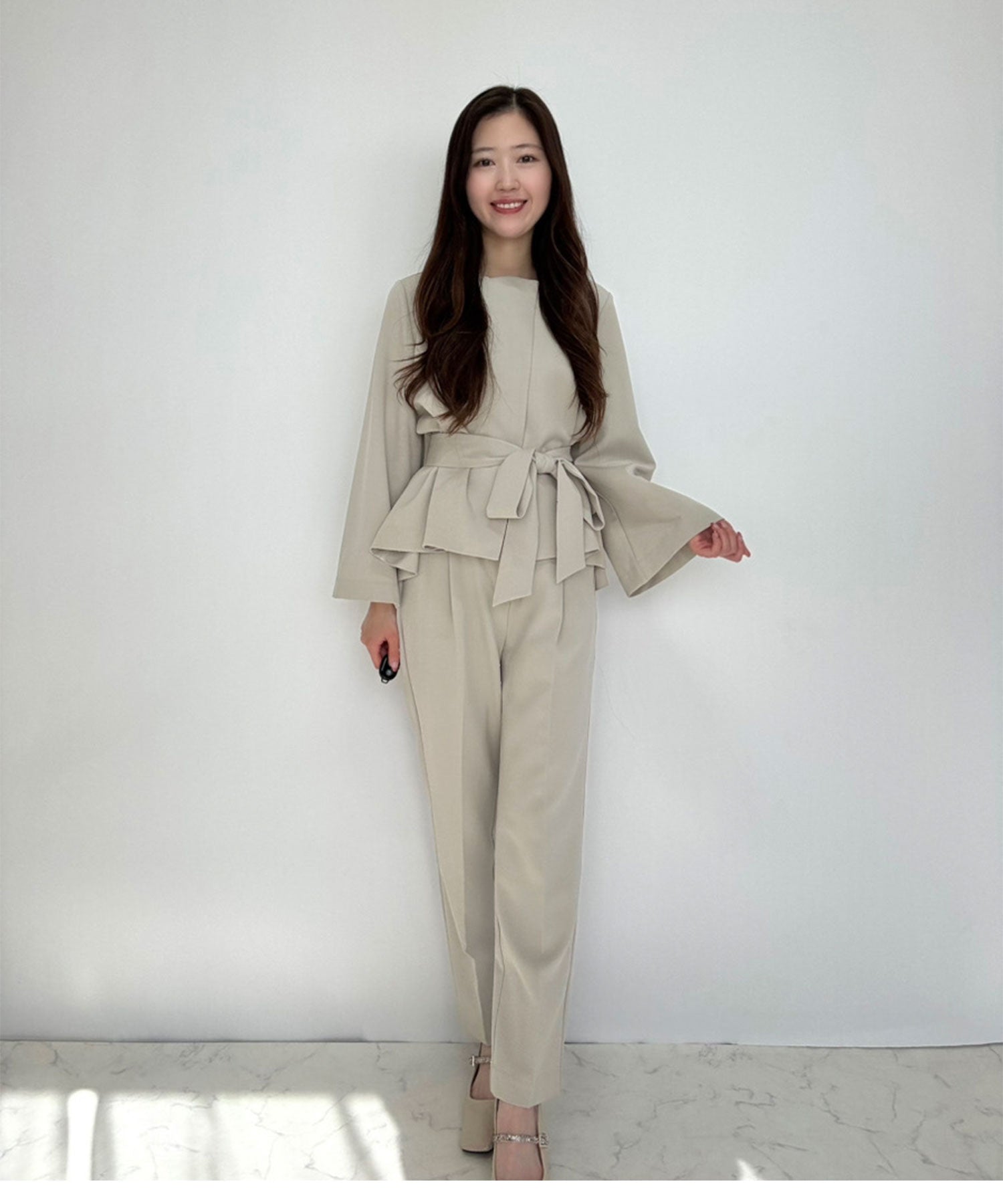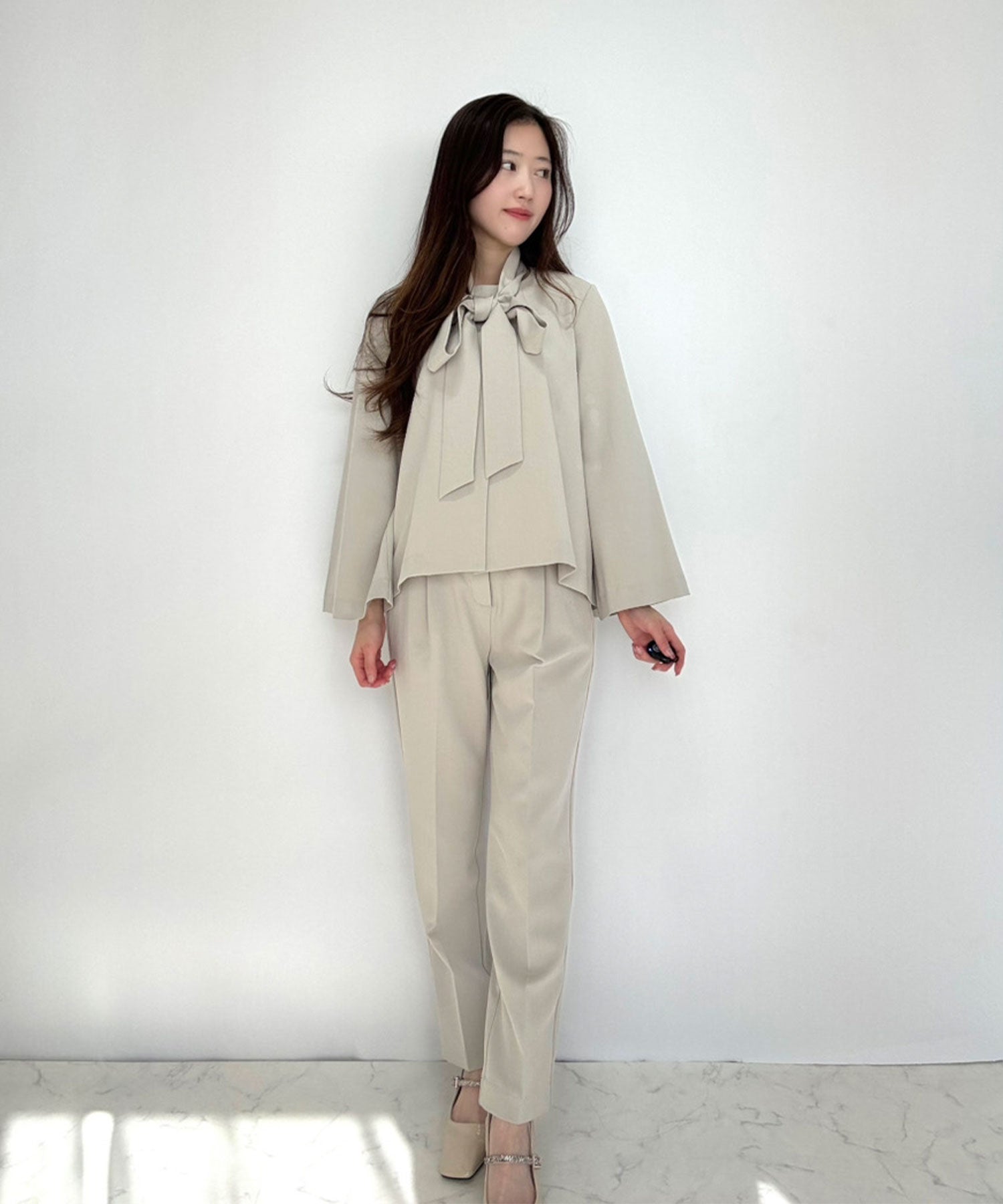 - 上品なシルエットと柔らかな印象を兼ね備えた、トップスとパンツの2点セットアップ