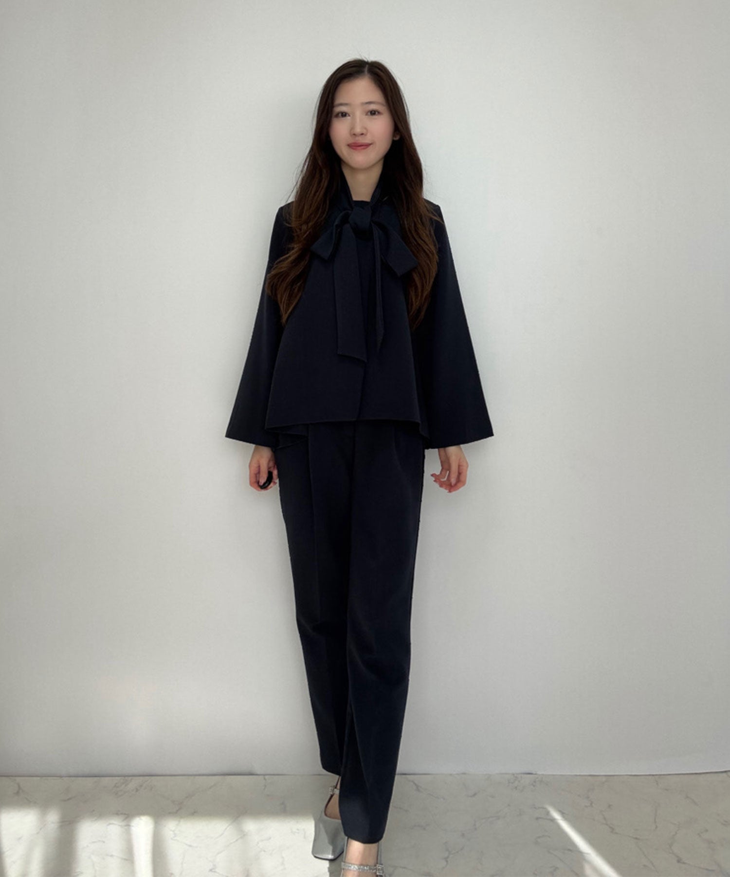 パンツはすっきりとしたテーパードラインで、脚をきれいに見せる美しいバランスに。