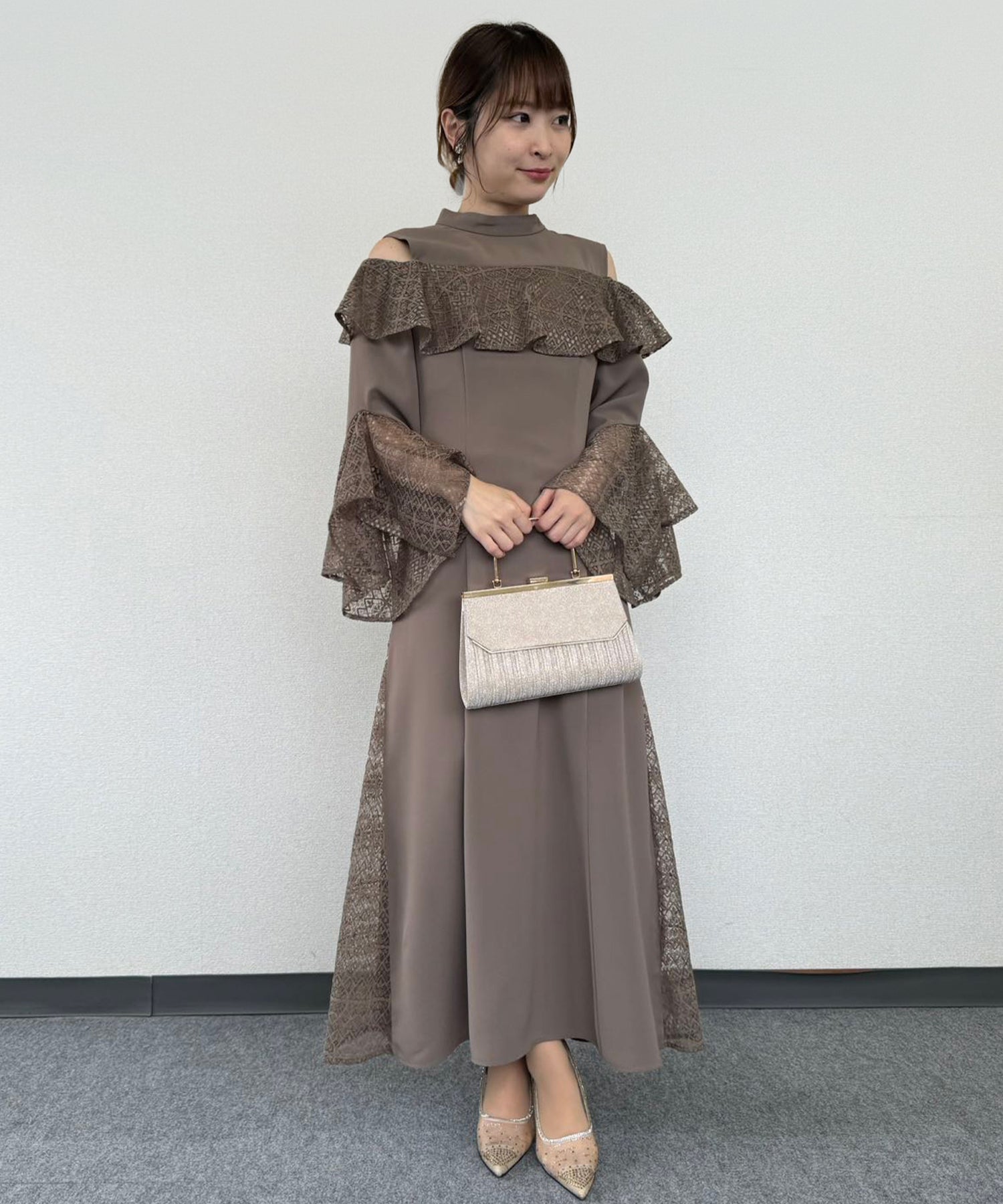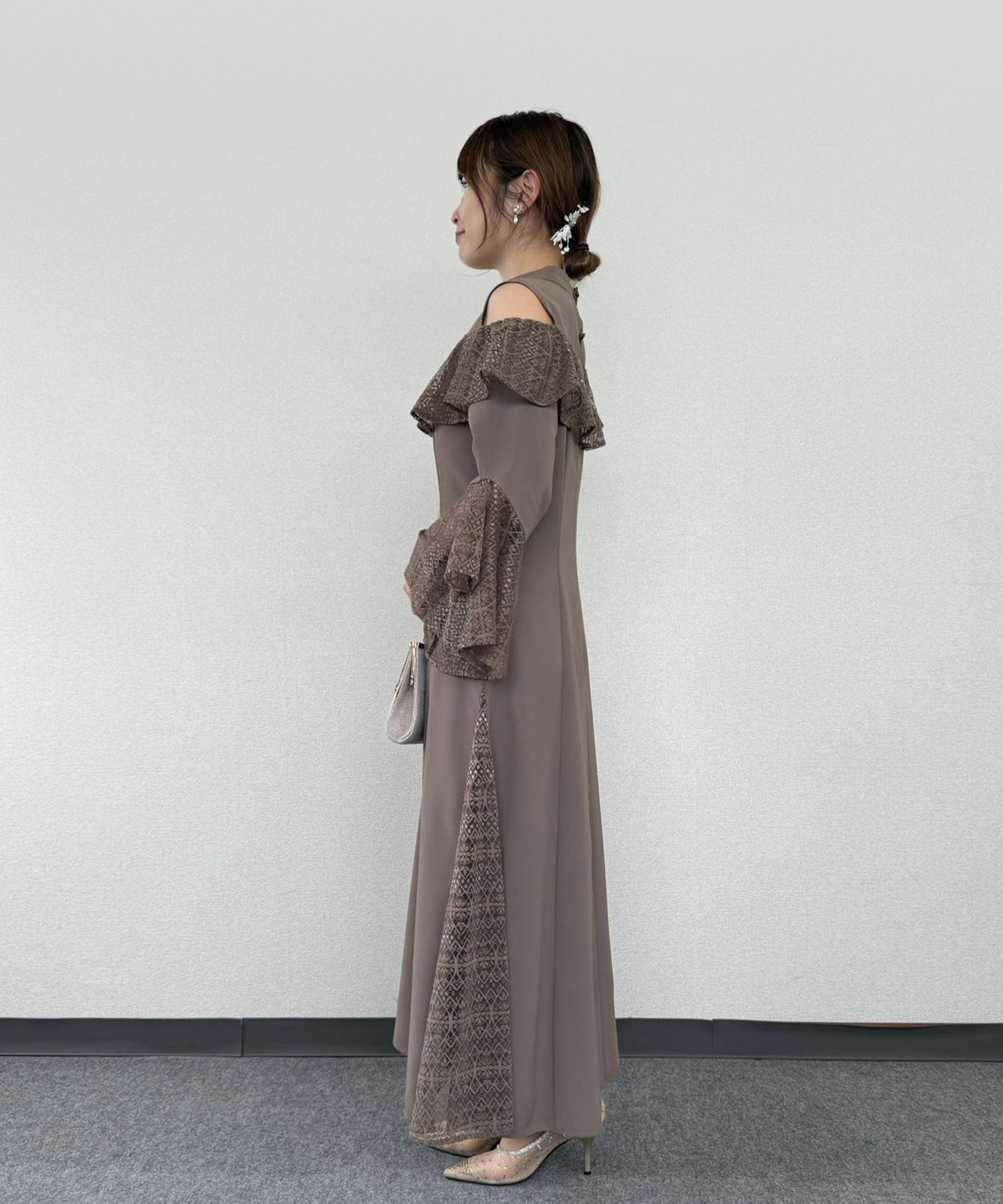 ドレス本体も無地の生地を採用することで、アクセサリーやバッグなどの小物類が合わせやすくなります。